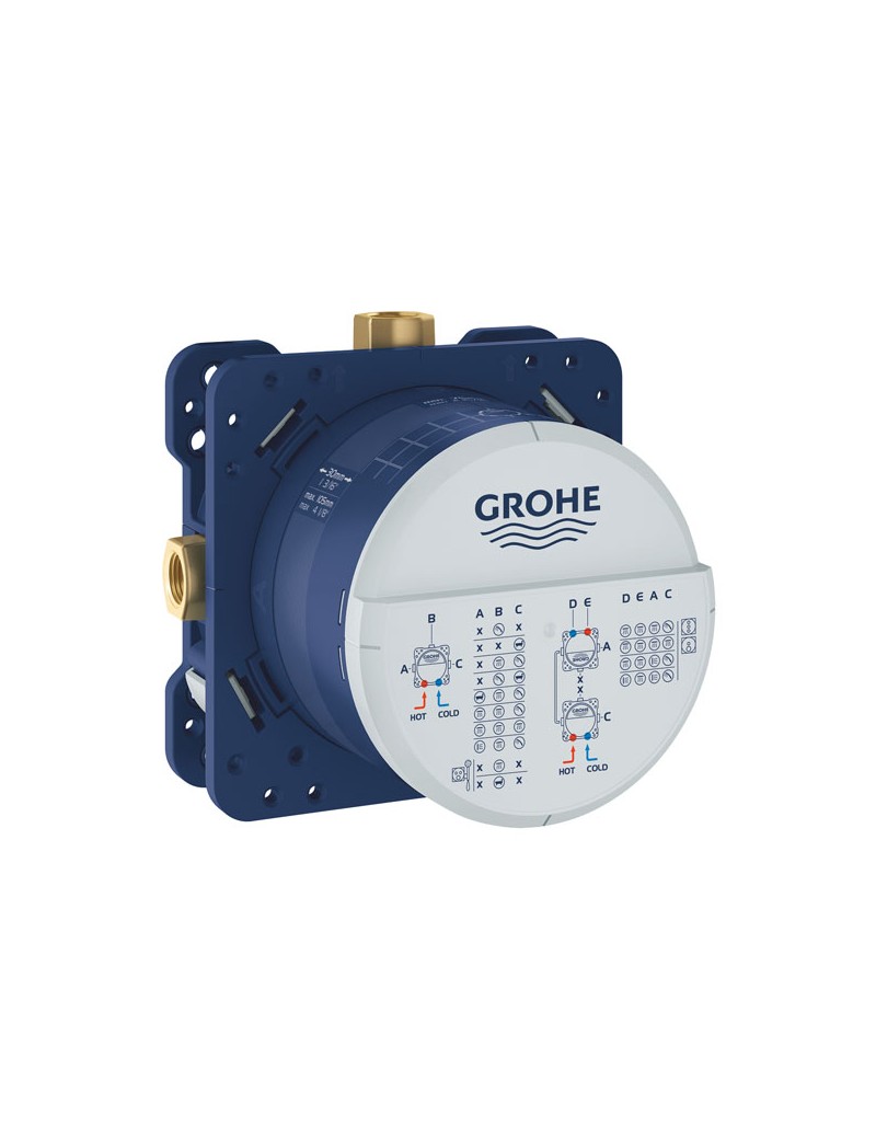 Corpo incasso universale Smartbox Grohe con 3 uscite da 1/2", 2 ingressi inferiori da 1/2" e profondità di installazione 75-105mm. Con raccordi in ottone DR.